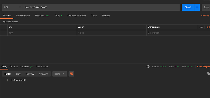 透過Postman 向 http://127.0.0.1:5000/ 發送GET請求,就可以看到回應的Hello world 囉~
