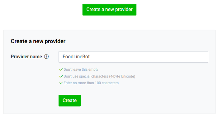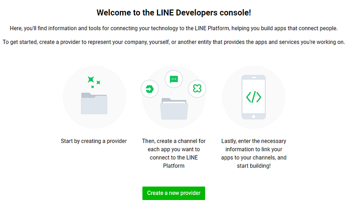 要開發LINE Bot前,首先需建立一個Provider,也就是服務提供者,主要用來讓LINE官方能夠識別這個LINE Bot是誰提供的。